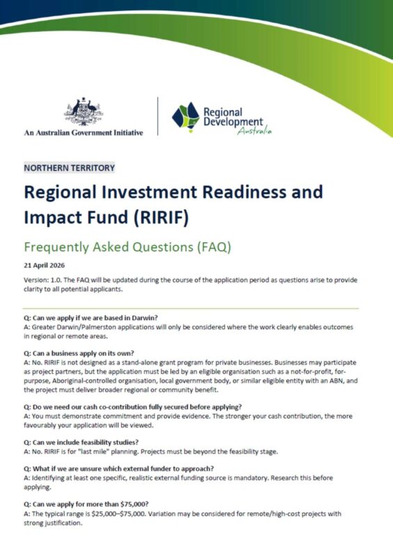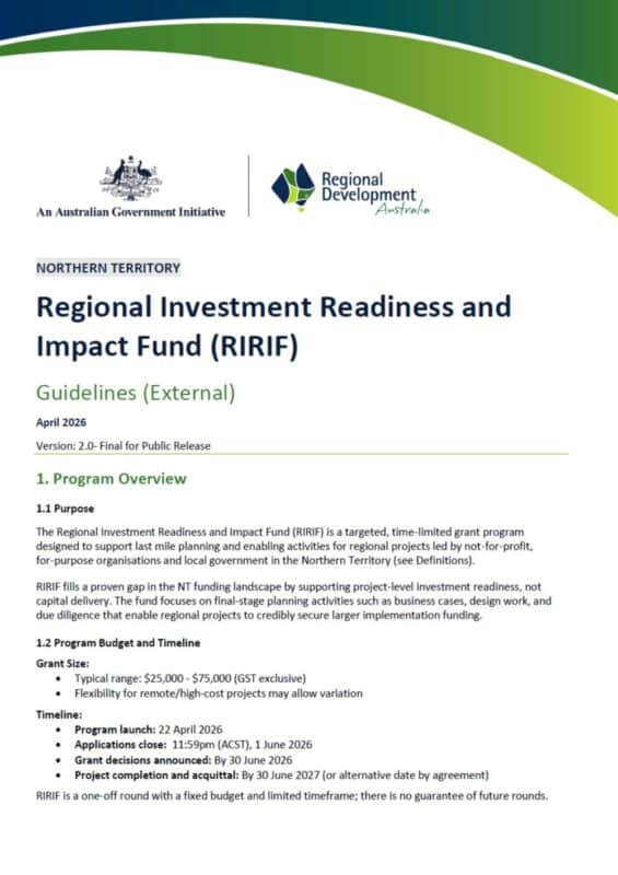 RIRIF is a targeted, time-limited grant program designed to support the final stages of project planning that enable regional projects to secure larger investment. The program focuses on investment readiness, not project delivery. It fills a recognised gap in the Northern Territory funding landscape by supporting projects that are beyond feasibility but not yet ready to attract major funding. Projects supported through RIRIF are expected to progress to external funding opportunities within a defined timeframe.