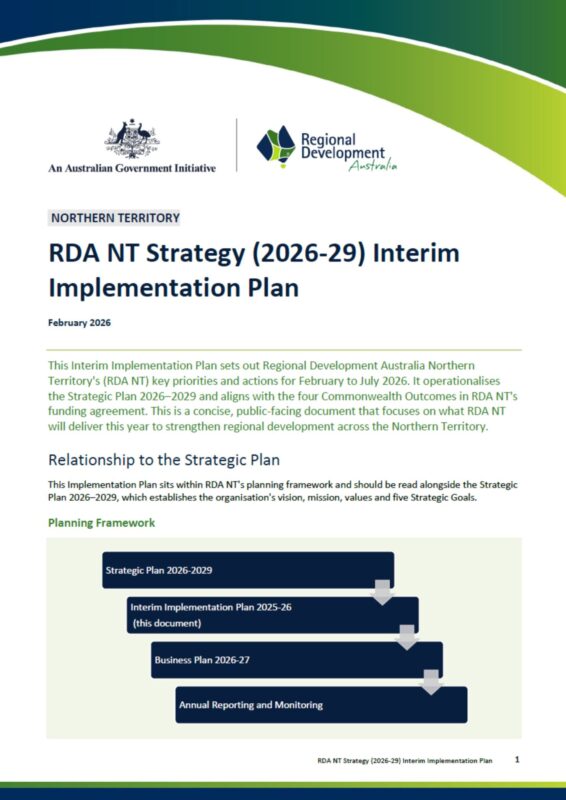 The Strategic Plan sets out RDA NT’s direction and priorities for 2026–2029. It aligns with and delivers on the Regional Development Australia Charter and the Australian Government’s Regional Investment Framework, as required under RDA NT’s funding agreement with the Commonwealth drawing on Territory-wide stakeholder engagement, Committee workshops and strategic discussions, comparative desktop analysis of other RDAs nationally, and RDA NT’s practical experience in regional development outcomes.